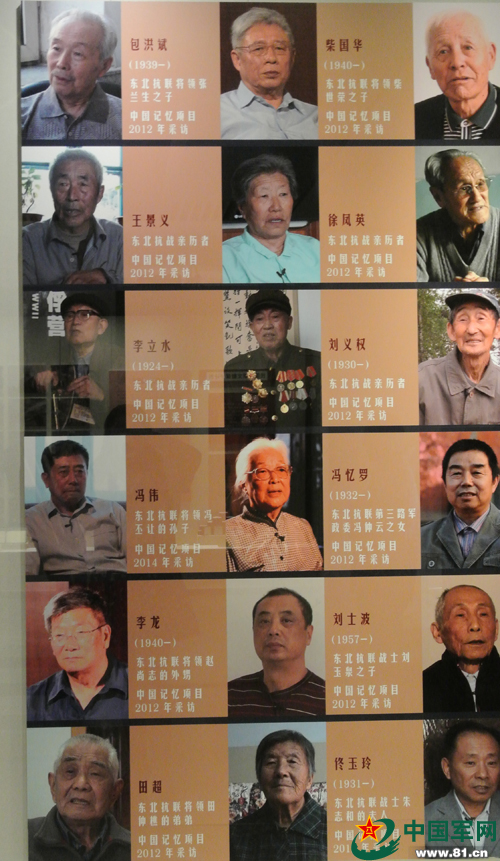 “中国记忆·东北抗日联军”项目对近20位抗联老战士和抗联子女进行了抢救性的口述史访问,获得了珍贵的第一手口述活资料。该项目成果丰硕,并作为此次展览的重要组成部分公开展出。图为“东北抗联老战士”主题展板。 记者 黄杨海 摄