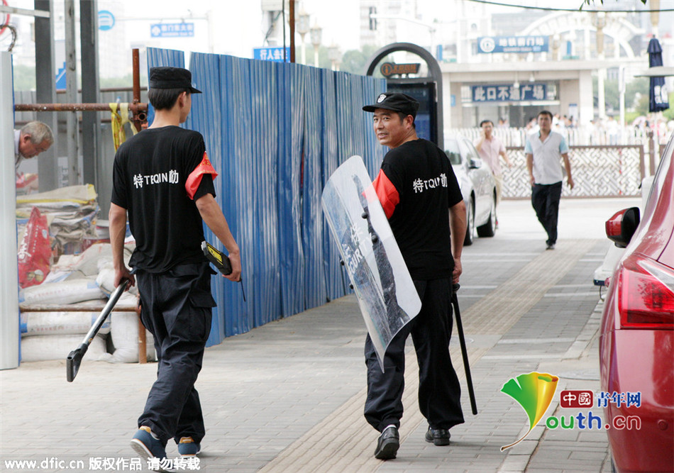 2015年8月14日,为迎“9-3”阅兵,北京安保升级,街头巷尾佩戴“红袖章”的市民及保安队伍开始集结站岗执勤。北京安保升级,天安门广场周边特勤保安巡逻。