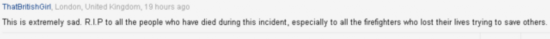 “真令人哀伤至极,愿在事故中不幸遇难的人们安息,特别是那些为挽救生命但牺牲了自己的消防员。”一名来自英国伦敦的网友写道。