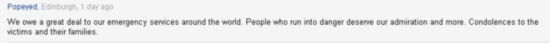 英国爱丁堡网友Popeyed表示,“我们对世界上所有的救援人员表示感激,那些奔向危险的人值得我们所有人的尊敬。对那些伤者及家属表示问候”。