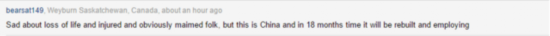 也有网友为中国加油,打气。“对那些遇难的人们、受伤的人们以及已经造成残废的人们感到哀伤,但这是中国,18个月内它会振作起来。”一名来自加拿大的网友说道。