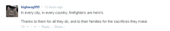 “在任何一座城市,一个国家,消防员都是英雄!感谢他们所做的一切,也感谢他们的家人所做的牺牲。”一名网友留言道。