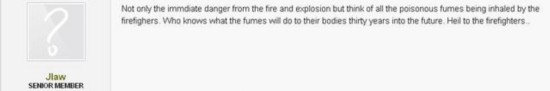 “除了随时可能发生的火灾及爆炸,想想这些消防员吸入的有毒烟雾吧。谁能预想在未来30年中,这些有毒烟雾会对他们的身体造成怎样的影响?向消防员致敬。”