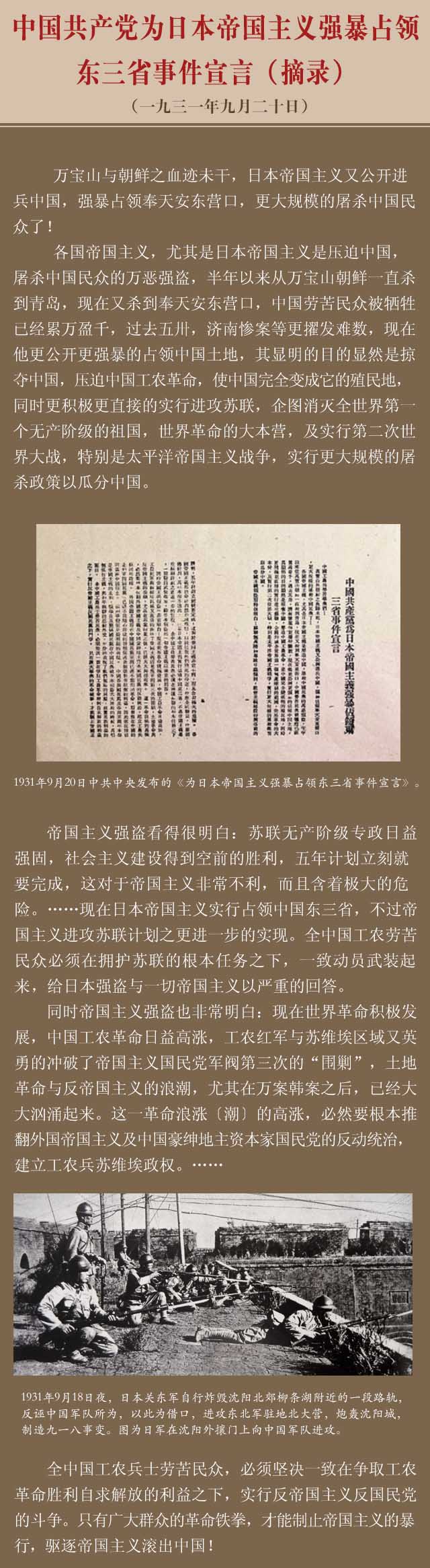“正当受着军阀战争与空前扩大的水灾的蹂躏牺牲痛苦不堪的时候,日本帝国主义又公开进兵中国,强占中国领土,屠杀中国民众了!任何一派的国民党与军阀都只能压迫红军与苏维埃,实行军阀战争,加工制造灾荒,及投降帝国主义,出卖民族利益。过去济南惨案及万宝山惨案及一切惨案都被国民党政府无条件投降出卖了!我们还要梦想国民党政府去抵抗帝国主义进兵吗?!国民党军阀的统治根本就是帝国主义压迫屠杀中国民众的保镖,我们应该一致动员起来,打倒国民党,打破一切和平改良的欺骗。只有群众斗争的力量,只有工农苏维埃运动的胜利,才能解放中国。”