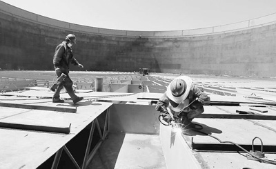 浙江舟山工人们战高温忙油库工程建设。8月4日,浙江舟山外钓岛光汇油库工程建设工地上,工人们正在10万吨的1202号油罐内作业,罐内温度高达60摄氏度以上,工人们严格按图纸施工,保证重点工程顺利完工。