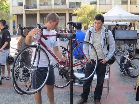 他们在学生会旁边支了一个小摊,帮经过的同学测量他们的自行车轮胎气压。如果压力不足的话,可以花一美元在他们的摊点充气。