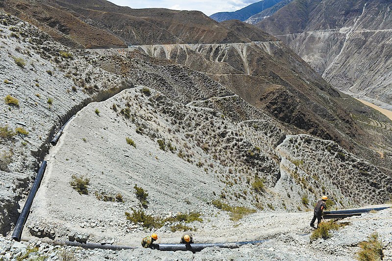 在曲雅贡乡真康坝取水点半山腰,工人正在铺建水管。