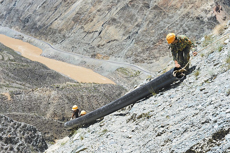 8月16日,一群“蜘蛛人”正在位于云南与四川交界处、海拔2800米的甘孜州得荣县曲雅贡乡真康坝取水点的悬崖峭壁上铺设引水管道。