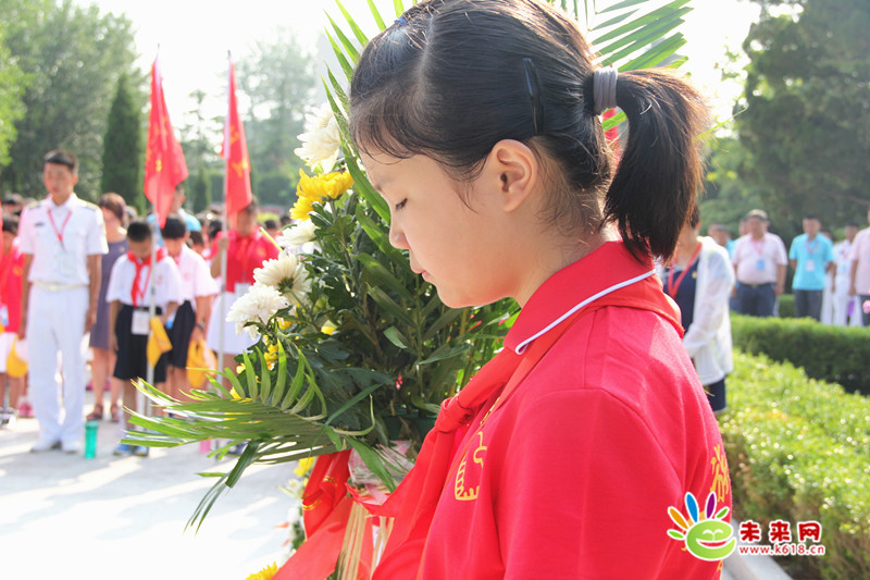少先队员们向石建烈士塑像敬献花篮。 摄影 罗宏博