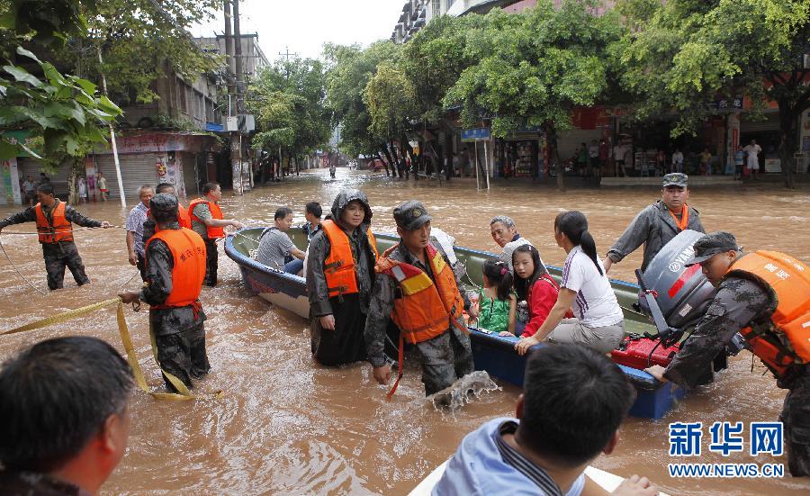 新华社照片,重庆,2015年8月17日 重庆大部遭遇强降水袭击 8月17日,救援部队官兵在重庆永川区板桥镇转移受灾群众。从8月16日夜间开始,重庆大部地区遭遇强降雨袭击,潼南、大足、永川等7个区县出现大暴雨。由于此次降雨过程来势凶猛,重庆市气象台已于8月17日拉响暴雨红色预警信号。新华社发(赵丰 摄)