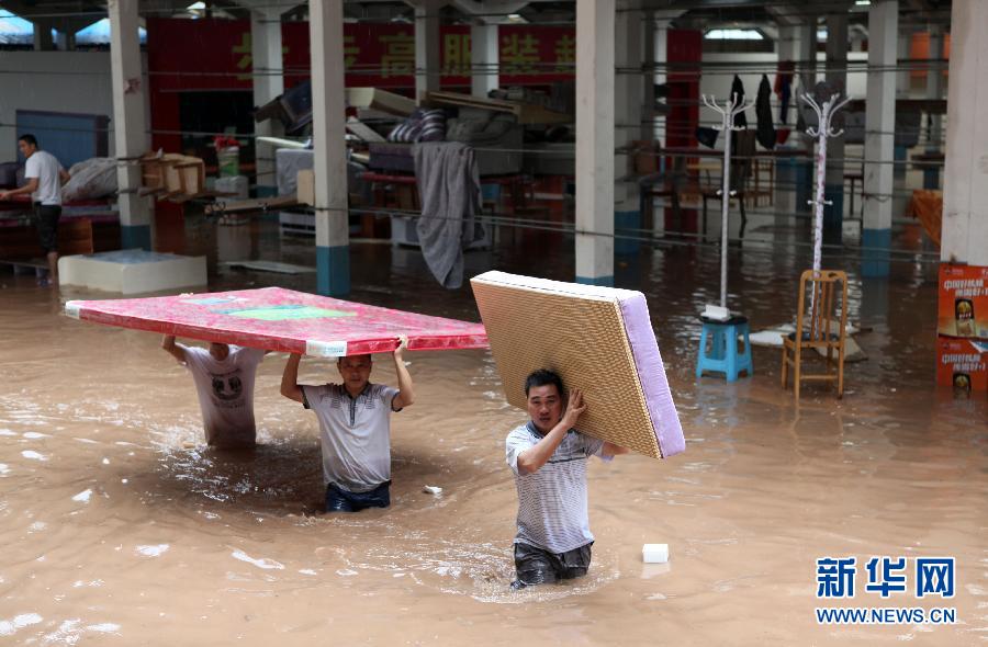 新华社照片,重庆,2015年8月17日 重庆大部遭遇强降水袭击 8月17日,重庆市永川区金龙镇机关群众在搬运物品。 从8月16日夜间开始,重庆大部地区遭遇强降雨袭击,潼南、大足、永川等7个区县出现大暴雨。由于此次降雨过程来势凶猛,重庆市气象台已于8月17日拉响暴雨红色预警信号。新华社发(陈仕川 摄)