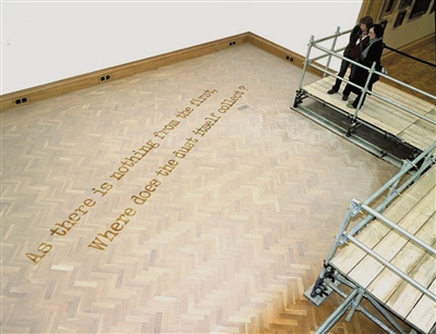 亲历了“9·11”恐怖袭击的徐冰用艺术进行了哀悼和反思。该作是徐冰从灾难现场收集来的灰尘所构成,首展于2004年的英国威尔士国家博物馆,他用一天的时间将“9·11之尘”吹到展厅中,尘埃落定后,地板上事先设定的留白显示出了禅语“本来无一物,何处惹尘埃”。展厅被一层像霜一样均匀且薄的粉尘覆盖,肃穆宁静,却给人一种很深的刺痛与紧张之感。