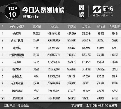 今日头条是目前国内用户量最大的新闻客户端,激活用户数达2.5亿,日活跃用户超过2000万。今日头条实时地从国内各主要网站采集新闻,然后迅速更新到客户端上。这一排行榜的数据由今日头条独家提供给新榜,综合各新闻单位的发文量、阅读量、收藏量、分享量、评论量各项指标得出新榜指数,并据此排名。