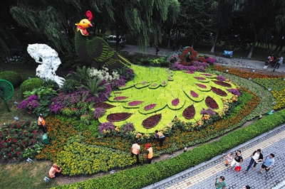 昨日,地坛公园南门,道路旁边的绿地里孔雀图案的花坛亮相。据介绍,这组名为“吉祥幸福”的主题花坛,占地面积约为680平方米,高约7.5米,同时装有夜景照明设施。据悉,截至目前东城区21处大型立体花坛已经摆放完毕,将持续展示到十月中旬。新京报记者 王贵彬 摄影报道
