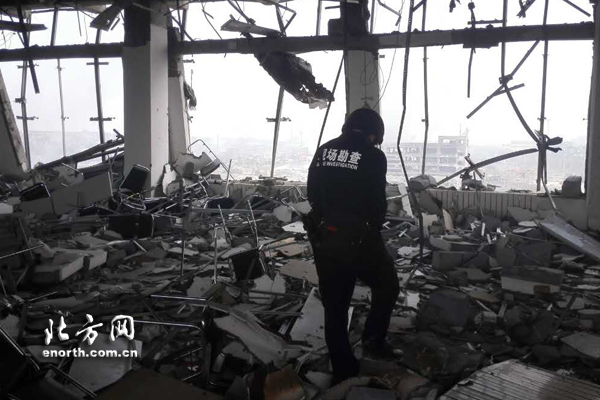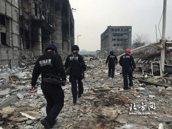 8月15日上午9点30分,天津市公安局物证鉴定中心爆炸检验科崔涛和他的三位同事,排列纵队进入了爆炸现场的危楼内,这是怕分散进入个人遇到危险无人援助,因此每个成员都要在他人视线范围内活动。“每人带着一个简易3M口罩、一个钢头盔、一身平日工作服,就这些。”崔涛向北方网新媒体记者打趣:“听起来爆炸检验科很神秘,但是,工作起来很接地气也充满了危险。”