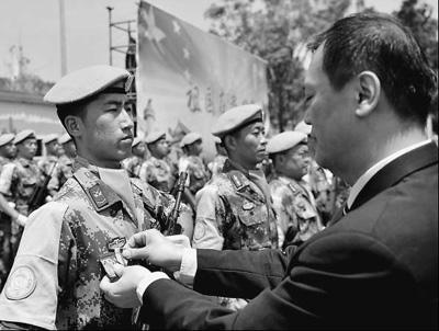 联合国官员给中国维和士兵授勋。