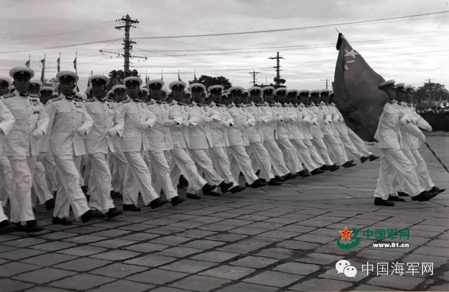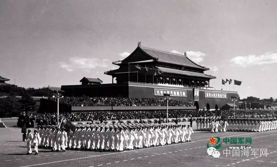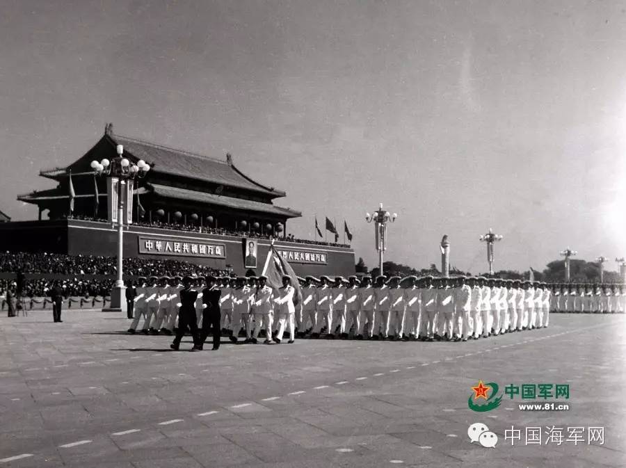 1959年国庆十周年大阅兵,由大连舰艇学院组成的海军学员方队第11次正步走过天安门,毛主席满脸笑容地对肖劲光司令说:“这一次,还是海军方队走得好!”阅兵结束后,海军方队又一次扛回了“受阅方队第一名”的红旗。