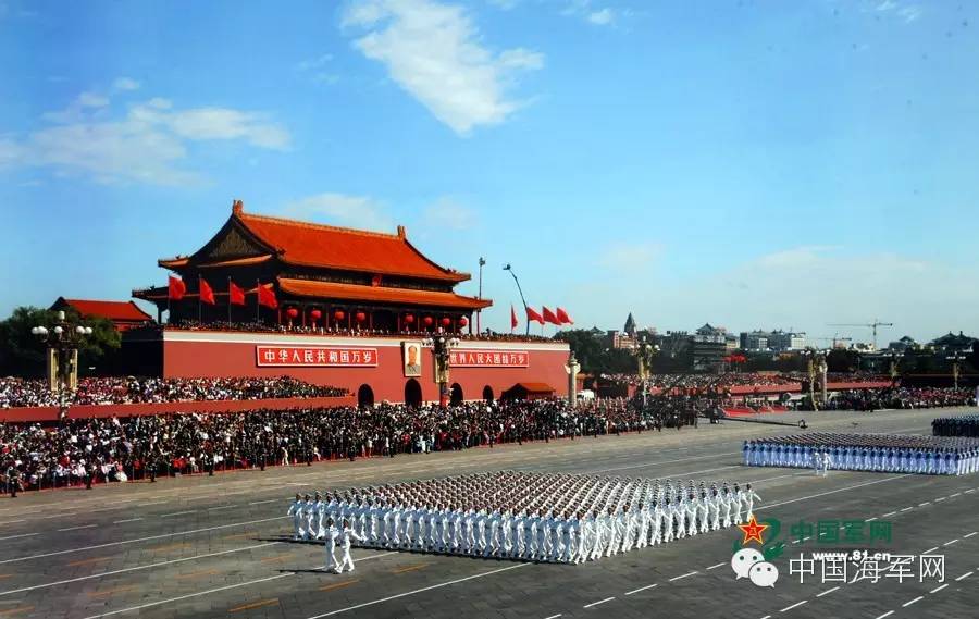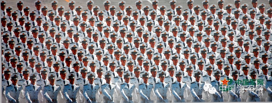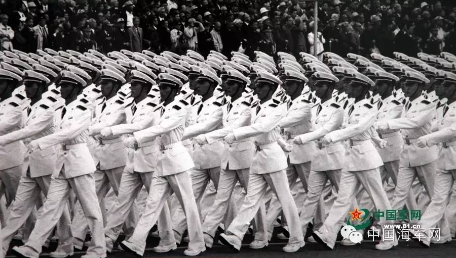 2009年大阅兵,海军学员方队犹如一艘白色军舰,劈波斩浪,一往无前地向天安门走来,由远而近,斜线到横线,从任何角度看都笔直如切,摆臂似海潮般舒展,迈步像波浪般奔腾,步步霹雳,天安门广场掌声迭起……