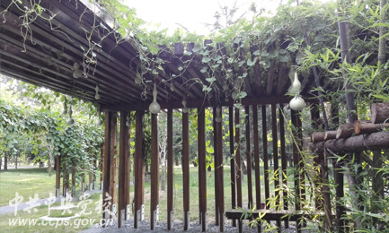 综合楼广场长廊上爬满了枝蔓,那是葫芦和藤萝的交响。从木条间垂下的葫芦,或大或小,绿而泛白,别有一番生活的意趣