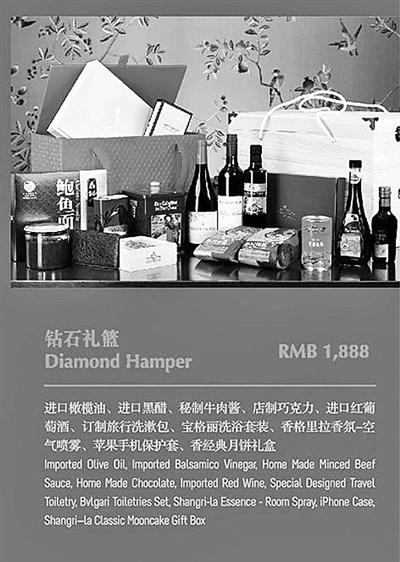 今年推出月饼搭配高档商品的酒店不在少数,比如国贸大酒店推出两款月饼礼篮,分别为价格1588元的“翡翠礼篮”与1888元的“钻石礼篮”。销售人员提供的月饼宣传单页显示,葡萄酒、橄榄油、鲍鱼、苹果手机保护套、茅台酒等13种搭配商品,价格从88元到1000元不等,顾客可以根据送礼的需求任意搭配。