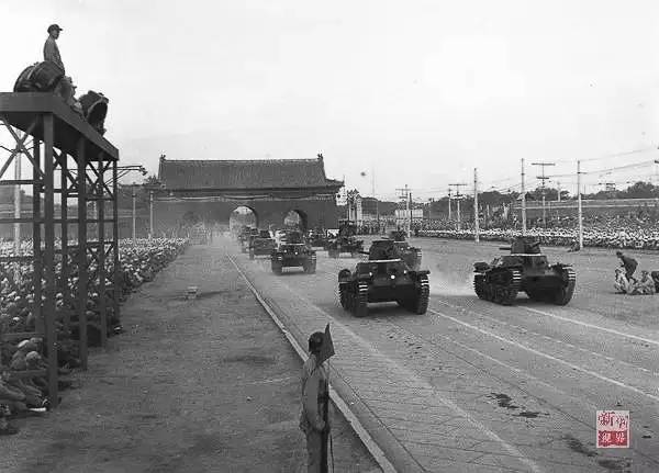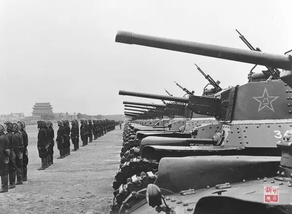 ↑坦克部队接受检阅(1949年10月1日摄)。 新华社记者 石少华摄