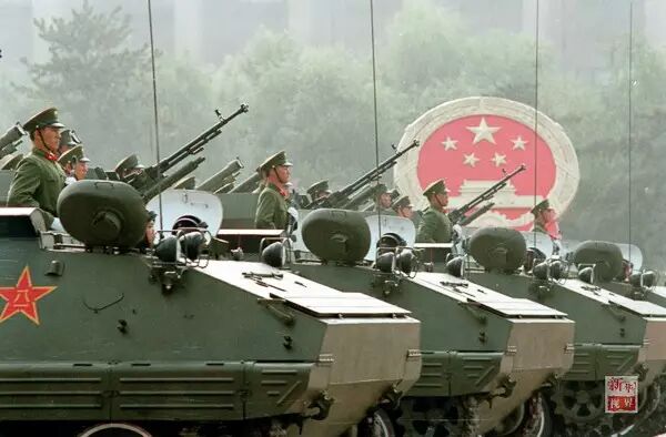 ↑履带式步战车方队通过天安门广场(1999年10月1日摄)。