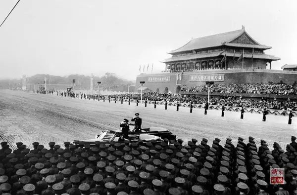 ↑1955年10月1日,国庆阅兵总指挥杨成武(车上后)陪同国防部长彭德怀检阅中国人民解放军陆、海、空军各部队。