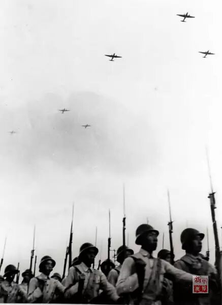 ↑通过检阅台的陆军、空军(1949年10月1日摄)。新华社记者 石少华摄