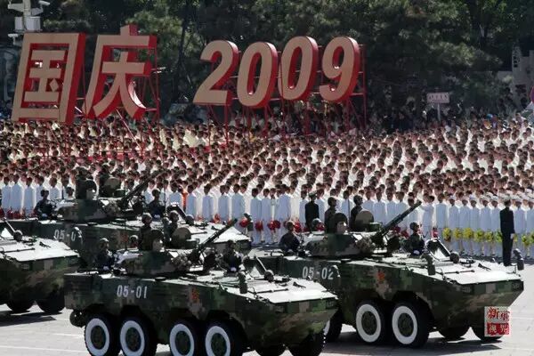 ↑新型轮式步战车方队通过天安门广场(2009年10月1日摄)。新华社记者 刘宇摄