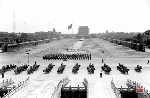 ↑国庆一周年阅兵式上,中国人民解放军骑兵部队通过天安门广场。 新华社记者齐观山摄
