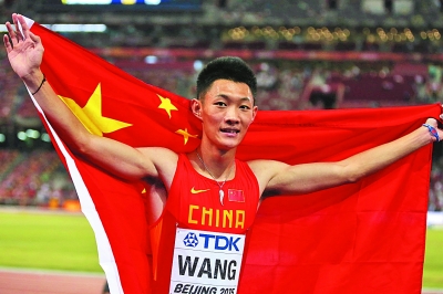 8月25日,王嘉男获得北京田径世锦赛男子跳远决赛铜牌。赛后,他身披国旗向观众致意。本报记者 陈茵摄