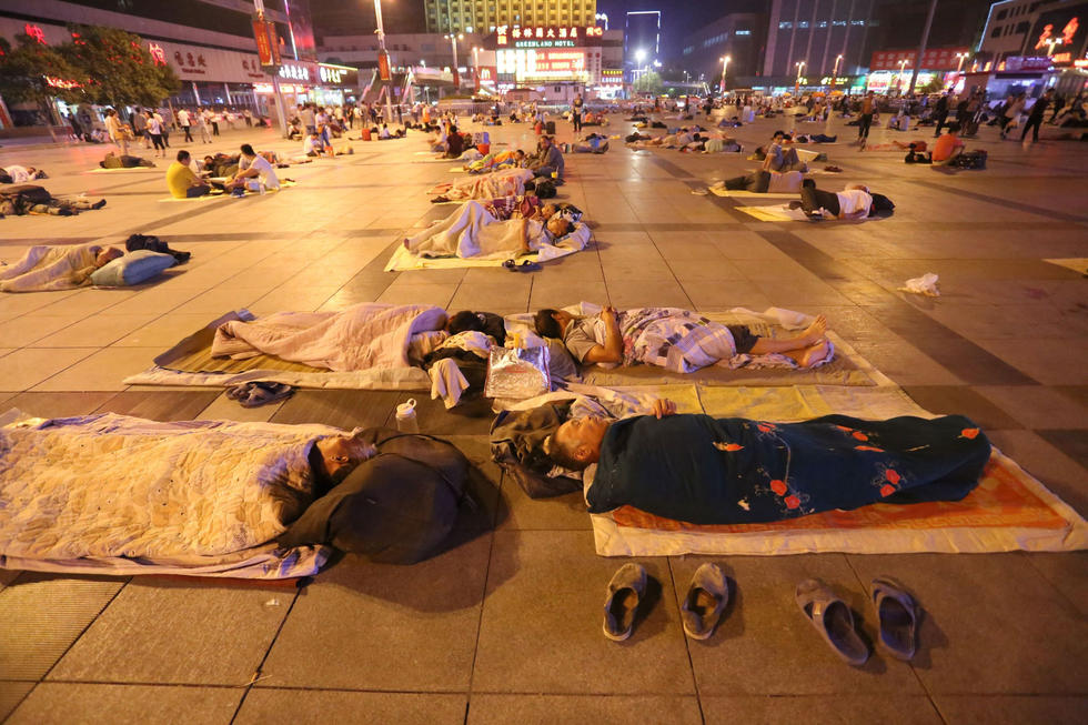夜幕下的郑州,在街头巷尾及火车站广场上,许多民工或候车的旅客露宿街头。