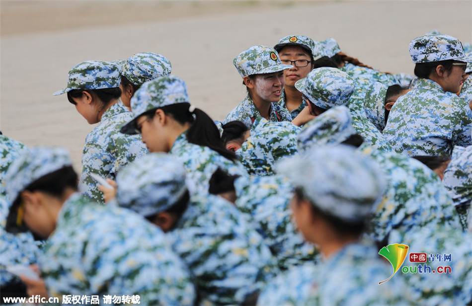 2015年8月25日,北京,北京大学2015年学生军训团进行消防演练及体验活动,图为参加活动开幕式的北大新生低头玩手机。