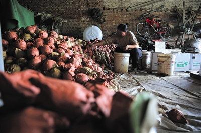 昨日,牛栏山镇史家口村果农娄玉玲在仓库里清理滞销的皇冠梨。新京报记者 卢淑婵 摄