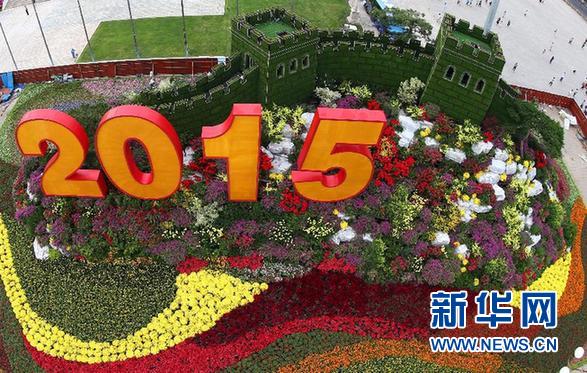 8月26日拍摄的天安门广场长城主题花坛。 8月26日零时,北京市花木有限公司承建的天安门广场纪念抗战胜利70周年花卉全部布置完毕。 新华社记者 殷刚 摄