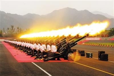 礼炮鸣放是9月3日阅兵活动的开篇之作。日前,在北京某部训练场,56门庆典礼炮呈“八”字形列阵东西两侧,28门礼炮为一响,交替鸣放70响,以庆祝中国人民抗日战争暨世界反法西斯战争胜利70周年。