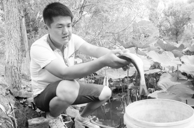 8月13日,山东省阳谷县西湖镇大学生村官刘凯正在赵佰升村藕坑查看白鲢鱼的生长情况。阳谷县开展多种形式的创业示范,促农增收。西湖镇大学生村官刘凯利用所学专业知识,帮助村里开发废弃坑塘30多亩,并在里面立体种养白莲藕、泥鳅、鲢鱼、螃蟹等,使废坑塘变成了“聚宝盆”,预计亩产值6000多元,为农民开辟了一条致富路。 陈清林张超摄