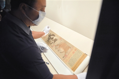 昨日,工作人员在故宫武英殿小心摆放国宝级珍品《五牛图》。 浦峰 摄