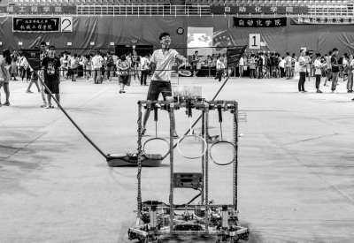 北科大体育馆前,两个金属框架搭成的方形“小车”借助下方轮子灵活移动,“小车”中部三个羽毛球拍不停地接发球,顶部的小转盘则不断供球,整个“小车”主要靠电能驱动。“这就是"羽球双雄"机器人。”一名刚刚与之对打完比赛的新生告诉北京青年报记者,“它的反应很灵敏,行动也很迅速,打起球来和真人一样。”