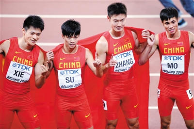 昨晚,北京田径世锦赛男子4×100米接力决赛,由莫有雪、谢震业、苏炳添、张培萌组成的中国接力队以38秒01的成绩第三个冲过终点,由于成绩排在第二的美国队犯规,中国队历史性地拿到了世锦赛的银牌。博尔特领衔的牙买加队以37秒36的今年世界最好成绩获得冠军,并实现了该项目四连冠,加拿大队以38秒13获得第三。
