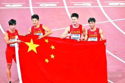 中国队苏炳添、谢震业、张培萌、莫有雪(从左至右)赛后展开国旗。本报记者 陈茵摄