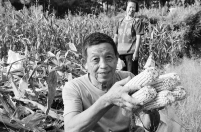 素以生产稻谷为主的湖南省邵阳县,充分利用旱地、房前屋后宅基地发展北方良种玉米,寸地不闲。今年全县20万亩玉米大获丰收,总产达一亿公斤,农民喜悦挂在脸上。图为邵阳县下花桥镇徐英村农民李贤义夫妇在采摘玉米棒。 李爱民摄