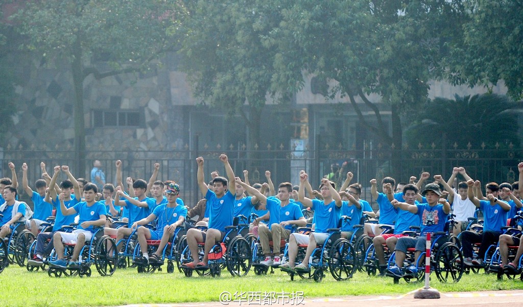 【400轮椅小子苦练2月 残运会表演健身操】为了在9月12日在蓉召开的全国第九届残运会开幕式上,表演一场别开生面的轮椅健身操。从7月起,成都体育学院的400名大学男生同轮椅为伴,刻苦练习,很多人手上都磨起了厚茧。据悉。表演完成后轮椅将捐赠给有需要的残疾人。