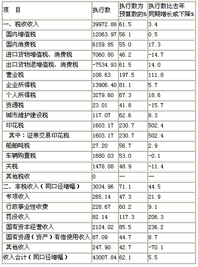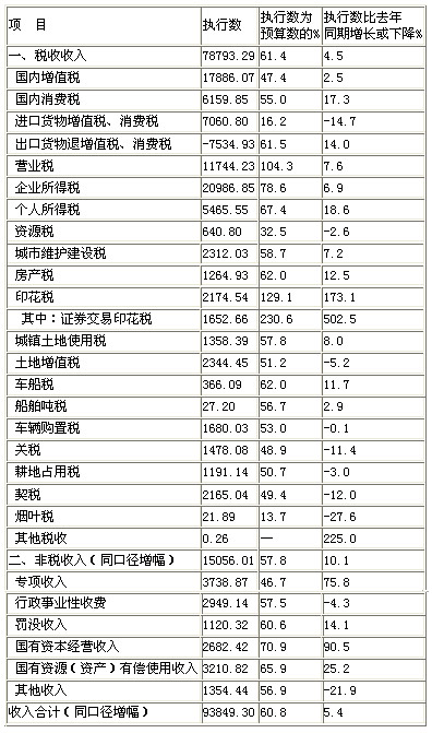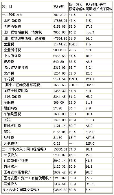 从收入看:受经济增长放缓、物价水平回落等因素影响,财政收入形势较为严峻。分税种看,税收收入增速回落,主体税种增长持续放缓。税收收入78793亿元,增长4.5%,同比回落4.1个百分点,为2010年以来同期最低水平。国内增值税增长2.5%,其中工业增值税零增长;企业所得税增长6.9%;进口货物增值税消费税、关税分别下降14.7%和11.4%。此外,出口退税增长14%,主要是从今年起出口退税增量由中央财政全部负担、税务部门加快出口退税进度等。分级次看,中央和地方收入低位增长,地方收入区域分化加剧。中央一般公共预算收入43008亿元(见附表3),增长5.5%,同比回落0.5个百分点。地方本级收入50841亿元,增长5.3%,同比回落5.5个百分点。东部、中部、西部分别增长6.8%、3.4%和3.1%,同比分别回落4.5个、7.4个和6.5个百分点。31个省份中两位数增长的有6个,个位数增长的有18个,收入下降的有7个。
