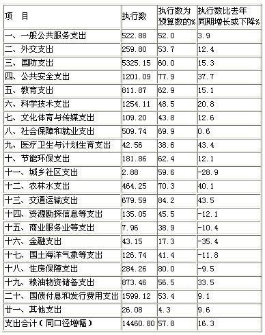 从支出看:在收入增速下滑情况下,财政部门努力盘活存量资金,加快预算执行进度,各项重点支出保障较好。分级次看,中央本级支出14461亿元,增长16.3%(见附表4),完成预算的57.8%,进度同比加快2.7个百分点;中央对地方转移支付预算下达48236亿元,完成预算的95%,进度同比加快5个百分点。地方一般公共预算支出75559亿元,增长11.4%,完成预算的51.8%,进度同比加快0.3个百分点。分科目看,全国教育、社会保障和就业、医疗卫生与计划生育、节能环保、农林水支出分别增长16%、21.4%、19.2%、19.3%、15.4%。