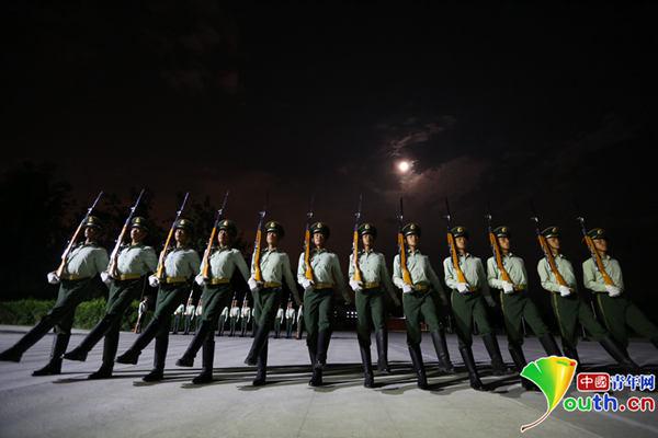 8月25日晚,升旗仪式护卫方队在夜幕中进行训练。中国青年网通讯员 牛成浩 摄