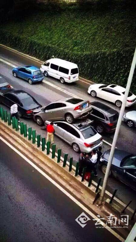 8月31日,早高峰约七点半,云南昆明北二环一处立交桥发生离奇车祸,一辆小轿车将前面另一辆小轿车铲飞,两车“叠罗汉”的照片在社交圈中被频频转发。记者了解到,车祸事发地点为昆明市北二环校场立交,6车追尾,“叠罗汉”的就是6车的中间两辆。图为交警正在将两车分开。(图文/东方IC、云南网)