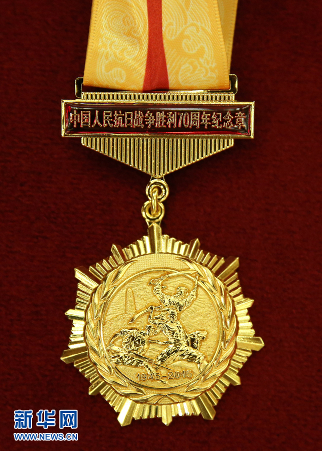 9月2日,中国人民抗日战争胜利70周年纪念章颁发仪式在北京人民大会堂隆重举行。30名抗战老战士老同志、抗战将领、帮助和支持中国抗战的国际友人或其遗属代表获颁纪念章。这是中国人民抗日战争胜利70周年纪念章。新华社记者 庞兴雷 摄
