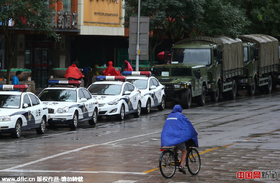 2015年9月1日,中国北京,北京王府井步行街内布满警用、军用车辆。一市民骑自行车经过,又显突兀。东方IC