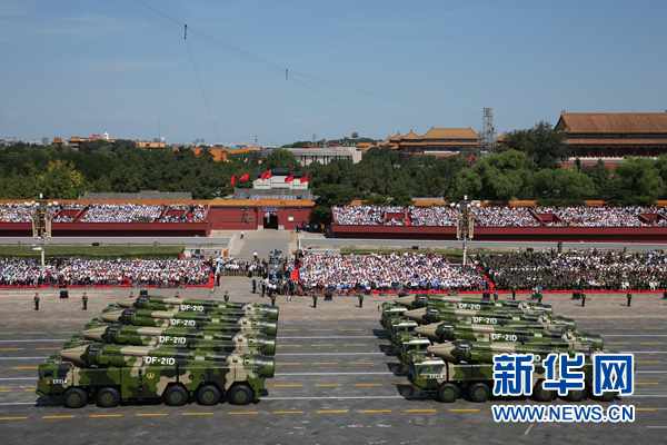 新华网天安门广场9月3日电(记者李宣良、张选杰)东风浩荡,雷霆万钧;大国长剑,安全基石。当参加胜利日阅兵的第二炮兵6个导弹方阵威风凛凛通过天安门广场时,全场观众报以热烈掌声。